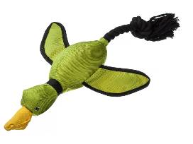 With the Kurgo Loft Wander Dog Bed, your dog can stretch out and relax right next to you. The top is made of Microtomic ripstop material for seasons of punishing use. Inside, 140-gram polytech fill adds bedlike cushioning lets your friend rest his tired bones. The bottom is made of Rufftex, a rugged, nonslip, waterproof material that'll keep the ground's dampness at bay. The design even features a hidden zip pocket for small dog-related essentials. When you're ready to go, the Kurgo Loft Wander outdoor dog bed rolls up into a bundle, and a built-in handle delivers easy portability. 36"L x 38"W x 3"H. Machine wash in gentle cycle with cold water. Hang to dry. Manufacturer's lifetime guarantee. - Hyper Pet Flying Duck Slingshot Dog Toy