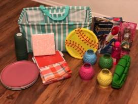 Set includes: a flying disk, an Ultra Stomp Rocket, playground ball, bubbles, Pop Star Barbie, 6 outdoor plates, 6 outdoor cups, checkered 60X84 tablecloth, napkins, 4 colorful lanterns, a box of Girl Scout S'mores cookies and a striped outdoor tote bag.