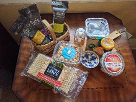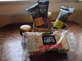 In the French tradition, charcuterie (pronounced "shahr-ku-tuh-ree") is the art of preparing and assembling cured meats and meat products. This basket boasts a Williams Sonoma charcuterie board and dip bowl, three Whole Foods cured sausages, fig spread, honey, almonds, olives, crackers, sea salt caramels, and a $25 whole Foods gift card to round out this epic food art experience.