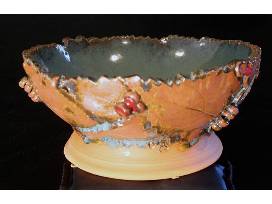 Green 10" ceramic bowl. Appliqued leaves, berries and vines. Dishwasher, oven and microwave safe. Hand crafted and wheel thrown by local potter Patti Nebel.