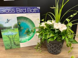 This package also includes additional garden accents like a glass bird bath and flowering planter.