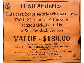 Redeemable after August 24, 2021. Certificates are NOT FOR RESALE, NON-TRANSFERABLE AND NOT UPGRADEABLE. To redeem this certificate please present to the FHSU Athletic Office, 138 Cunningham Hall, 785-628-4050. Monday though Friday, 8:00am-4:30pm.