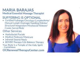 - 1-1/2 hour therapeutic massage from certified therapist, Maria Barajas, qualified in oncology and lymphatic drainage.