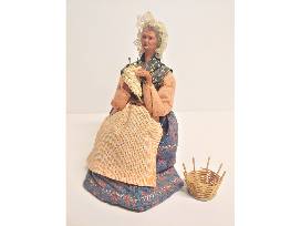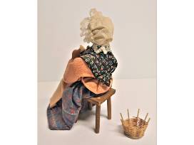 Creating a beautiful cream knitted piece, is this woman sitting on a stool with her weaving basket beside her. She is a total 8" in height and must be picked up at CET or ThinkTV - shipping not available. Donor value is $15.