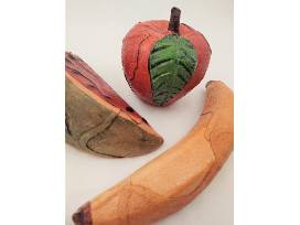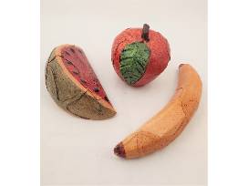 1If you are looking for a unique interpretation of a still life, then look no further. These three, leather covered fruits are crafted from individual pieces of dyed leather secured over a solid base. The red apple has a 5 inch diameter, the watermelon wedge is 8 inches long, and the golden banana is 11 inches long. Some of the leather wrap on the watermelon wedge is loose. Item must be picked up at CET or ThinkTV. Shipping is not available.