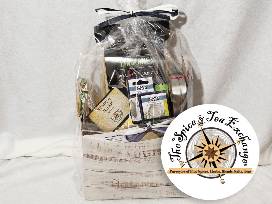 Gift basket is filled with a variety of whole fresh spice blends, loose-leaf teas, pasta and seasonings that any food lover and tea enthusiast will enjoy!