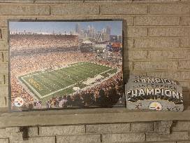 Hang this great view of Heinz Field, home of the Pittsburgh Steelers, on your wall at home! Pittsburgh Steelers Heinz Field Canvas wall hanging and 2x 2010 AFC Championship Long-sleeve Shirts (Small, Large).