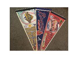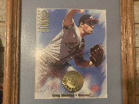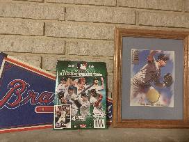 3 Atlanta Braves Penants with MLB Trading Card Book and Donruss Studio Framed Greg Maddux 8x10 Print #2732/5000.