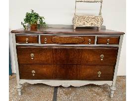 This dresser has been beautifully re-finished by Bucks County Furniture Restoration Company. The dark wood color complements the light colored gray trimming. The hardware is a faded gold color with an extraordinary amount of detail. The spacious bottom two drawers provide a great storage space. Don't miss your chance to bring home this piece, bidding opens May 8th! Dimensions: 49 1/2 L x 29 3/4 W x 36 1/4 H. This item is eligible for complimentary ReStore delivery. See Auction Terms & Conditions for restrictions.