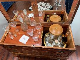 This antique Lane blanket chest has been converted into a bar, equipped with a sliding tray for easy access to the spacious area underneath. Intricate design into the wood body makes this piece beautiful and unique, perfect for a dining room. This piece includes all items shown in staging photos. Re-purposed by Meredith Matarese of JasperMoon Interiors. **All items seen in staging are included with this piece.** This item is eligible for complimentary ReStore delivery. See Auction Terms & Conditions for restrictions.