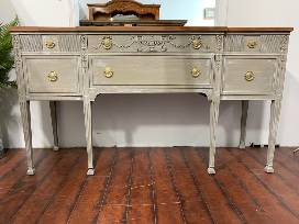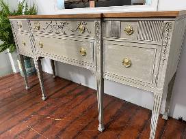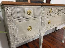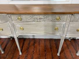 This beautiful gray chest with a light brown, wooden, tabletop has been re-finished by Breanna Hitchens from Re-URBAN-It. The gold hardware and intricate wooden carving really stand out in this piece. Plenty of tabletop room leaves space for lamps, photos, and other decorative items. This item is eligible for complimentary ReStore delivery. See Auction Terms & Conditions for restrictions.