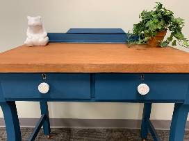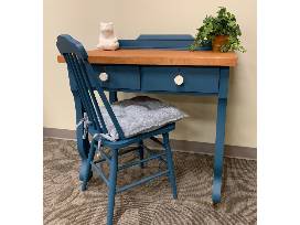 This desk has been designed and re-finished by Pierce Wilson Design. The desk and chair are the same vibrant blue that really draws your attention. The desk also has two lockable drawers which can both be opened by the same key. The round, white knobs of those drawers have spotted blue polka dots to compliment the attractive desk and chair color. Bid now for the chance to take home this custom-designed piece! Dimensions: 35 1/2" L x 19 3/4" W x 31 3/4" H.
