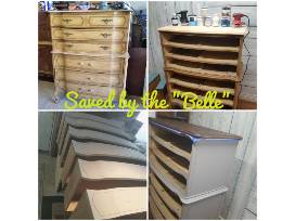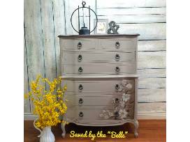 This vintage chest has a sophisticated style and a promise of springtime. The color is Recolor Paints "Pewter", a soft beige with gray undertones, the perfect neutral for any decor. The magnolia flowers are a furniture transfer symbolizing endurance & eternity; one of the first blooms of spring. The top was sanded and stained in a rich chestnut. The whole piece is top coated in a matte polycrylic for durability. The 6 drawers, which feature new wrought iron hardware, are like new inside and glide smoothly. This piece could last a lifetime and become a new family heirloom. Designed and Refinished by Linda Fortunato at Saved by the "Belle". Dimensions: 40"L x 19"W x 55"H.