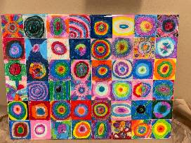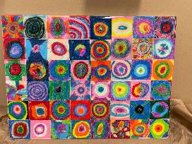 Students in fifth grade were inspired by the colorful artwork of Wassily Kandinsky, and each student was charged with filling up two squares with vibrant concentric circles. The results are fantastic, and there is such diversity in the outcome of all of the individual pieces. The beauty of this project is seeing how all of the unique and colorful squares unite to form a bold, cohesive and joyful abstract composition. The artwork, on an 18 x 24 canvas board has a finishing layer of resin that protects the artwork and also gives it a brilliant glassy finish. The resulting artwork is stunning and is such a beautiful representation of the students. Artissima Studio in Fox Chapel was thrilled to collaborate with Mrs. Studebaker at CDTCA to realize this beautiful collaborative artwork.