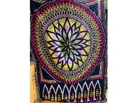 A 66-inch x 96-inch hand-crocheted blanket of colorful acrylic yarn in a stained-glass window pattern.