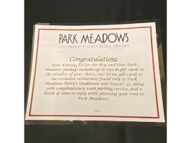 This package has everything for a full luxurious day at Park Meadows. Win up to $150 to the Park Meadows retailers of your choice! Take a break from shopping with a $50 gift card to Perry's Steakhouse and a $50 gift to Seasons 52 with complimentary valet parking! Enjoy a gift basket while planning your retail getaway complete with a bottle of Belle Glos Pinot Noir and Park Meadows merchandise like a baseball hat, flask and golf tees!