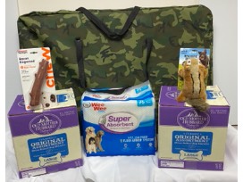 The ultimate doggie care package for taking care of your new puppy! This package includes a fold up travel crate, training pads, training treats, a couple of toys and a one-year supply of delicious dog biscuits.