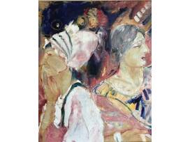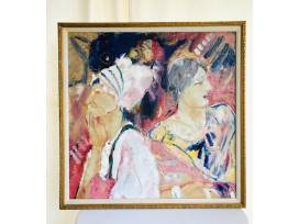 1This acrylic on canvas was painted by artist Terry Barrett. She was a Miami University student who studied under artist Crossan Curry. Her use of loose brush strokes indicate the influence of post abstract art. The figures in the painting suggest women of earlier times. The framed size is 34" h x 36" w.