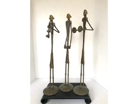 3 Abstract figurines of metal brass musicians. One playing saxophone; one playing accordion and one on cymbals. Each figurine is approximately 18" tall. Black wooden stand included, 11.5" wide x 6" deep x 1.5" tall.