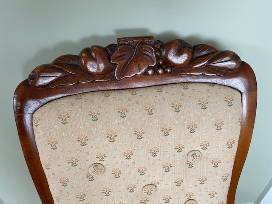 The neutral fabric complements the dark wood of this chair. The head has a hand-carved vine and fruit motif.