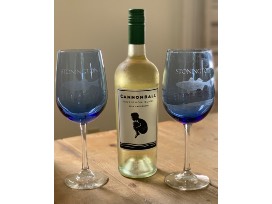 Also included are two etched blue wine glasses and a bottle of Cannonball Wine!