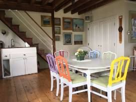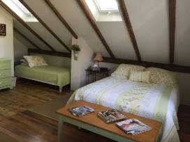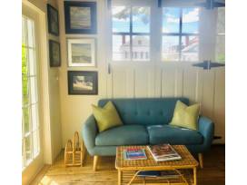 Up to 3 guests will enjoy a one-week stay at a private retreat in the heart of Stonington Borough behind a stately village home. The lower level is enhanced by art and adining/sitting/TV area. 2nd level bedroom accommodates 2 or 3 with a queen bed, twin bed, desk/work area, bathroom, and air conditioning. Guests will have access to outdoor seating and a secret garden featured on the Garden Tour.