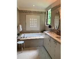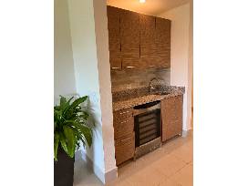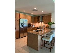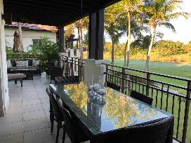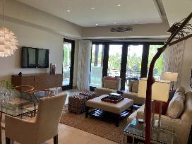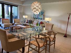 The apartment, located on the eighth fairway of the golf course, has two bedrooms with king-size beds, and a third with two double beds. Each has its own full bath. A fully-equipped kitchen with a bar opens to the living/dining room. Also included is a laundry room, large outdoor terrace with barbeque, and all the toys needed for a beach vacation -- surfboard, boogie boards, sand toys, and a four-person golf cart. It is a short walk to the beach and Beach Club pool.