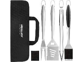 - Grill Joy 6 piece Heavy Duty BBQ Grill tool set made of extra thick stainless steel. Includes: spatula, fork, tongs & cleaning brush.