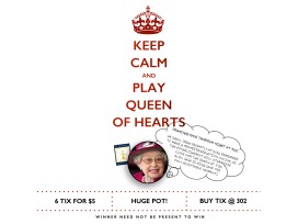 Place your bets on the Queen of Hearts EVERY week with this winning raffle! Get 30 chances each week until the Queen is found. The coordinator will check in with you before each week's drawing to pick your winning number(s) and place your tickets in the drum. Three cheers for you (and the Queen)!