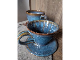 Blue handmade ceramic coffee pour-over and mug.