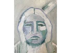 Stunning Abstract Native American art by local artist, Greer Robear. You'll want to see this beauty in person! Painted in muted blues, this truly striking piece would be a wonderful addition to any collector's gallery.