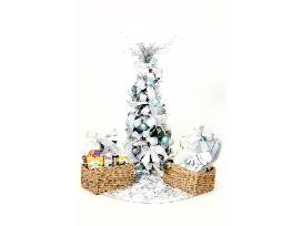 "Hello. This is your captain speaking. You are going to love this tree!" Our "In Flight Snacks" Tree is bright and delightfully decorated in white, silver and icy blues! Toy airplanes add whimsy and playfulness to this tabletop cutie. Travel never looked so good when you discover all the items that accompany this fun tree! From Pillow Bar travel pillows with silk pillow cases to overflowing baskets filled with travel gifts and goodies, you'll have everything you need for a pleasant flight! Get your bids in now before they take off!