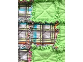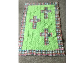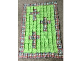 Lime green background with plaid multi color frame-like edges & crosses inside. Has raised tufted edges for handsewn patches.