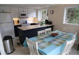 * Kitchen, dinner table with six chairs, living room, and washer/dryer