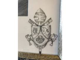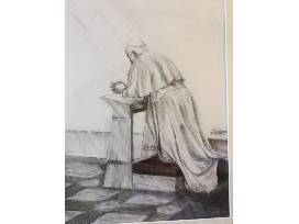Original drawing by DC-born artist Luis Peralta del Valle, created in 2012. This original pencil artwork on paper and mat board, framed with glass, is entitled Pope Benedict XVI Praying. It was inspired by the Holy Father's April 18, 2008, visit to the Pope John II Cultural Center - now the John Paul II National Shrine - where the Holy Father paused in prayer before the Blessed Sacrament. This occurred between his address to representatives of non-Christian religions, and his greeting to Jewish leaders as they prepared to celebrate Passover. The artist worked at the Center at the time.