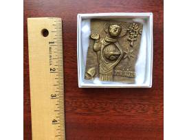 Small (2" x 1.8") solid bronze plaque of St. Dominic, made in Germany. Depicts Holy Father Dominic with a book, preaching, with the traditional icongraphy of lilles, a star, and a discarded bishop's mitre.