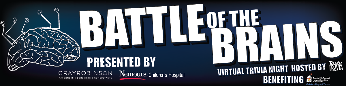 Please join us for a night of FUN at our VIRTUTAL Battle of the Brains Trivia Night, benefiting Ronald McDonald House Charities of Central Florida. Not only will you get to test your knowledge of everything from pop culture to local history, you'll also be supporting the thousands of families who turn to one of our three Orlando Houses each year.