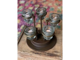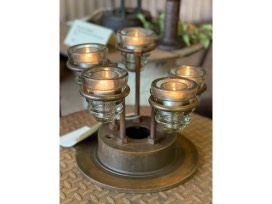 The base is a repurposed brake rotor. The glass are recycled, antique insulator glass from the telegraph lines.
