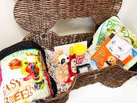 (2) Custom Hand-made Blankets, Pet Toys, Bone Shaped basket, and Dog Anxiety Thunder Jacket.
