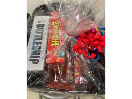 Basket including Battleship, Hedbanz, Rory's Story Cubes - Classic, Rory's Story Cubes - Star Wars, Uno, Taco Vs. Burrito, popcorn tubs, and a Lou Malnati's Gift Card for $25.