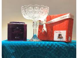 Fannie May Pixies, Harney & Sons Tower of London Tea Blend, and a vintage crystal candy bowl.