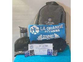 Merchant & Craft backpack, water bottle 25 ounces, winter hat, adult medium t-shirt, toiletry bag, plus 2 free one day guest passes from La Grange Fitness ($75)