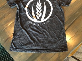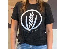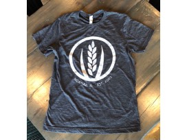 Classic fit crew neck t-shirt in soft slub knit cotton, heather charcoal color with white washed MFB wheat logo.