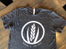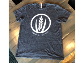 Classic fit crew neck t-shirt in soft slub knit cotton, heather charcoal color with white washed MFB wheat logo.