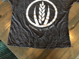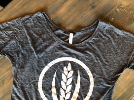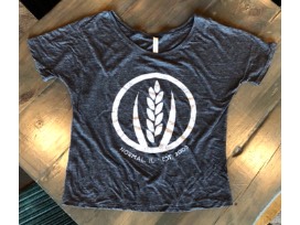 Slouchy scoop neck t-shirt in soft slub knit cotton, heather charcoal color with white washed MFB wheat logo.