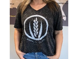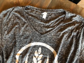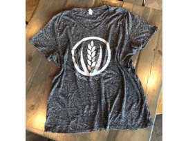 Classic fit, v-neck t-shirt in soft slub knit cotton, heather charcoal color with white washed MFB wheat logo.