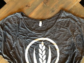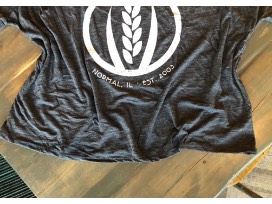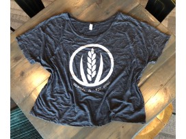 Slouchy scoop neck t-shirt in soft slub knit cotton, heather charcoal color with white washed MFB wheat logo.
