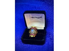 This ring features multi-colored stones surrounding a dome shaped moonstone center.