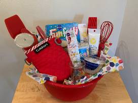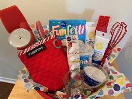 Everything you need to have hours of fun baking! Basket includes mixing bowl, spatula, whisk, tongs, fruit knife, pizza cutter, baking brush, oven mitts, baking cups, measuring cup, Funfetti Cake & Cupcake Mix, Funfetti Vanilla Frosting with Sprinkles, icing tip set, red icing and blue icing tubes.