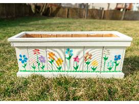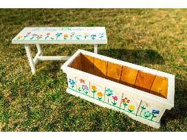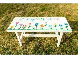 Decorate your home or garden with this wooden bench and planter set. The 3rd Grade students have personalized these pieces with fingerprint flowers. Each piece is approximately 31 inches long and can be used indoors or outdoors.